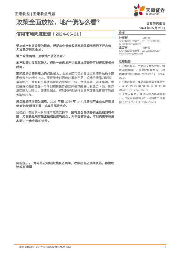 【天风证券】【20240521】信用市场报告:政策全面放松,地产债怎么看?-15页