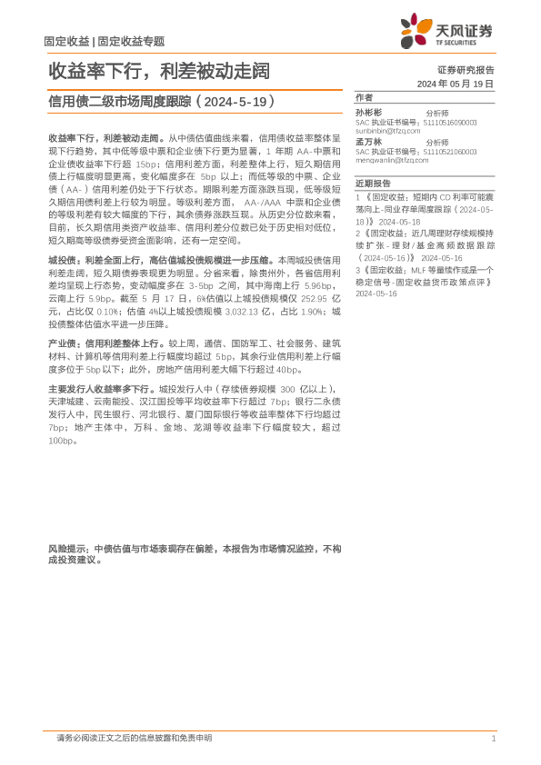 【天风证券】【20240519】信用债二级市场跟踪:收益率下行,利差被动走阔-14页