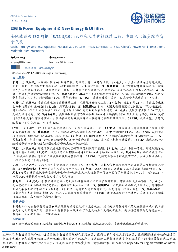 【海通国际】【20240522】全球能源与ESG行业:天然气期货价格继续上行,中国电网投资维持高景气度-40页