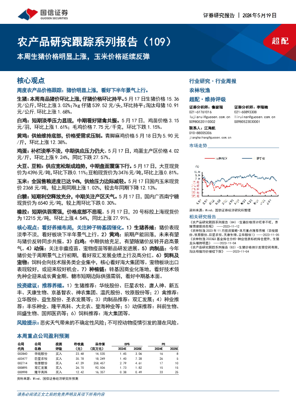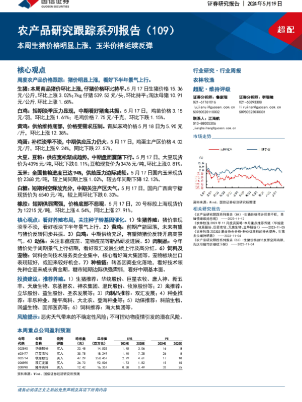 【国信证券】【20240519】农产品研究跟踪系列报告(109):本周生猪价格明显上涨,玉米价格延续反弹-26页