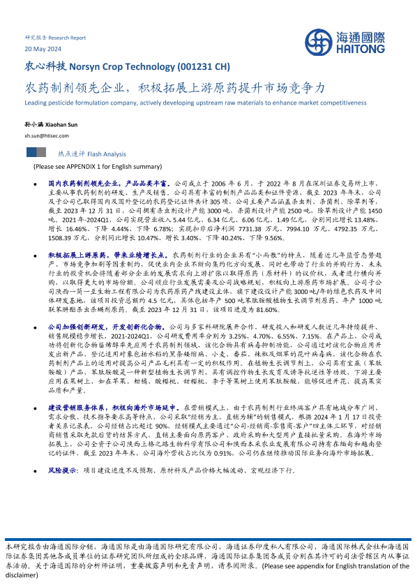 【海通国际】【20240520】农心科技-农药制剂领先企业,积极拓展上游原药提升市场竞争力-10页