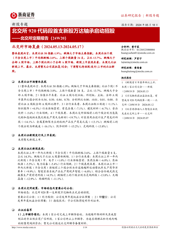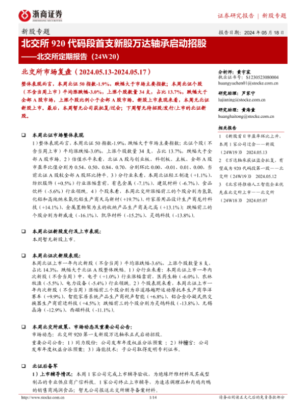 【浙商证券】【20240518】北交所定期报告(24W20):北交所920代码段首支新股万达轴承启动招股-14页