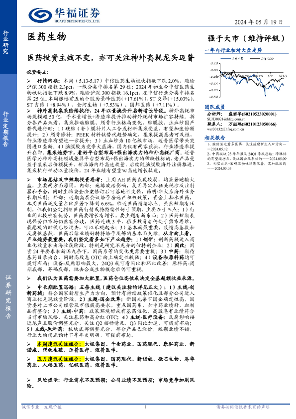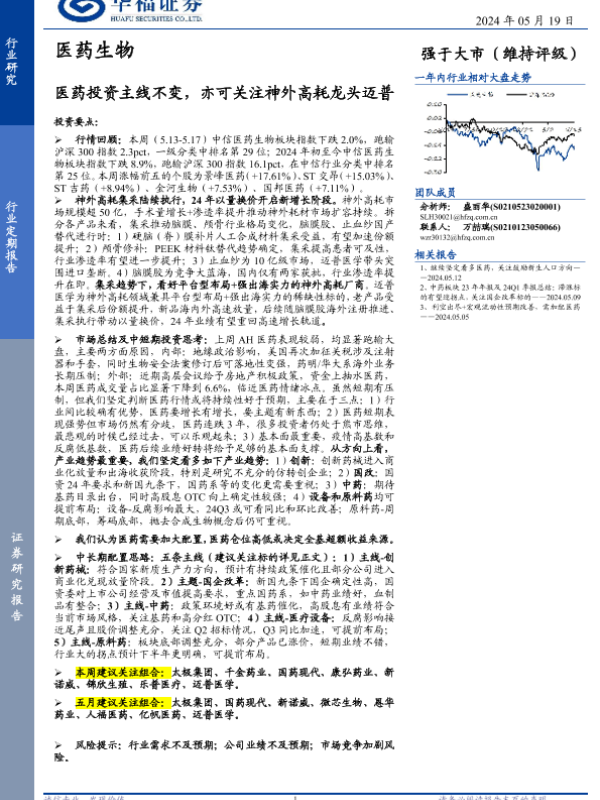 【华福证券】【20240519】医药生物行业定期报告:医药投资主线不变,亦可关注神外高耗龙头迈普-15页