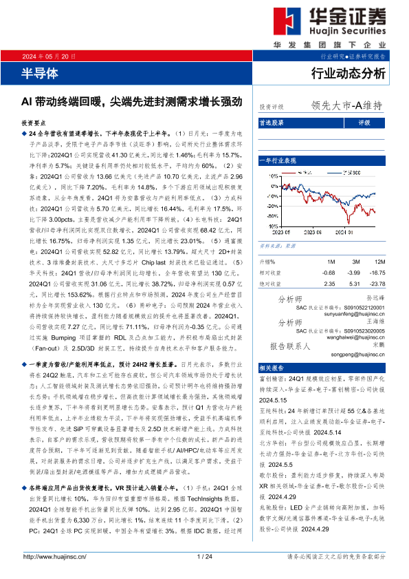 【华金证券】【20240520】半导体行业动态分析:AI带动终端回暖,尖端先进封测需求增长强劲-24页