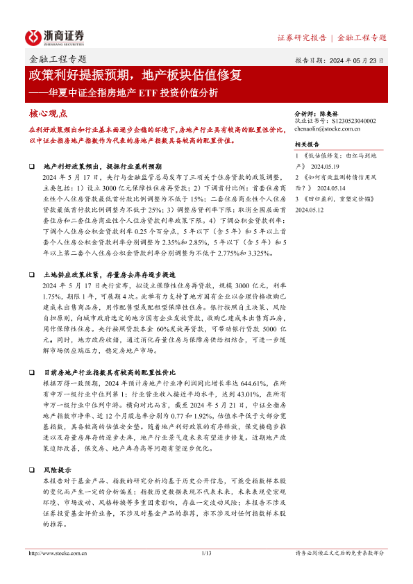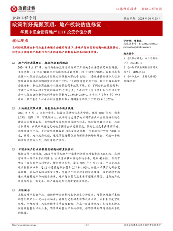 【浙商证券】【20240523】华夏中证全指房地产ETF投资价值分析:政策利好提振预期,地产板块估值修复-13页