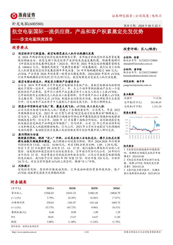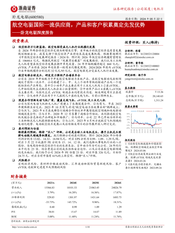 【浙商证券】【20240522】卧龙电驱深度报告:航空电驱国际一流供应商,产品和客户积累奠定先发优势-18页