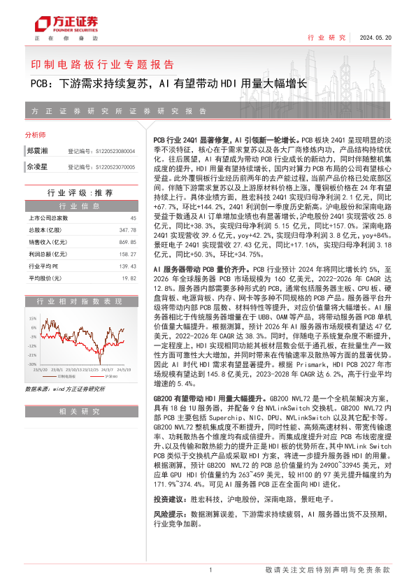 【方正证券】【20240520】印制电路板行业专题报告PCB:下游需求持续复苏,AI有望带动HDI用量大幅增长-32页