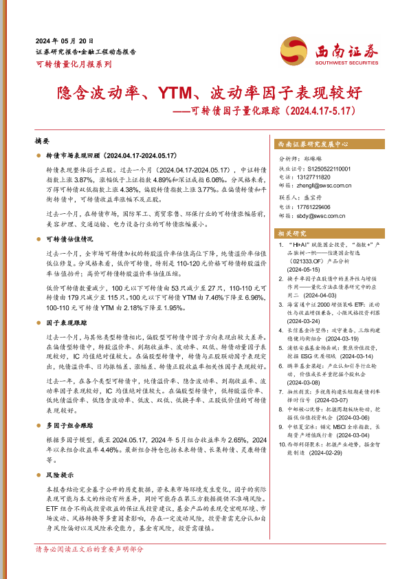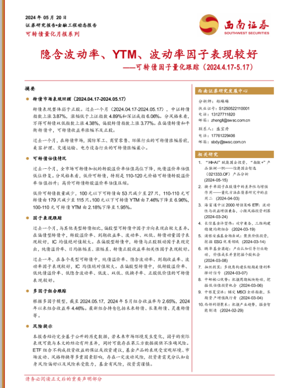 【西南证券】【20240520】可转债因子量化跟踪:隐含波动率、YTM、波动率因子表现较好-14页