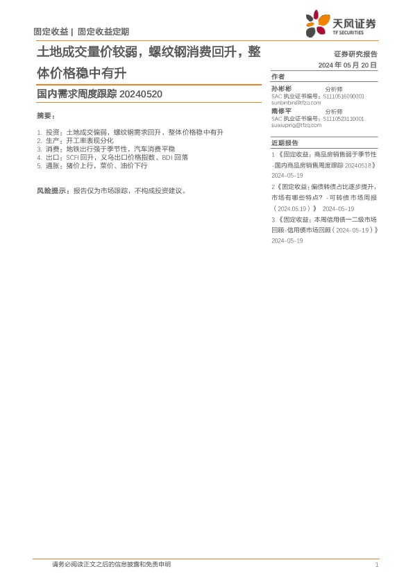 【天风证券】【20240520】国内需求跟踪:土地成交量价较弱,螺纹钢消费回升,整体价格稳中有升-10页