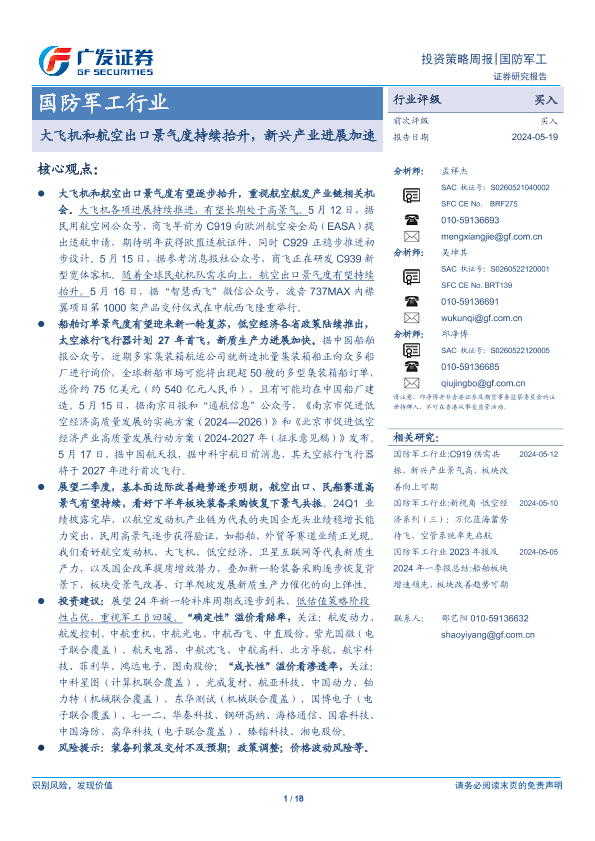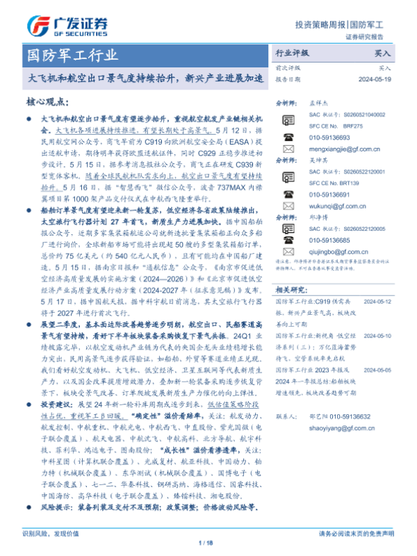 【广发证券】【20240519】国防军工行业:大飞机和航空出口景气度持续抬升,新兴产业进展加速-18页