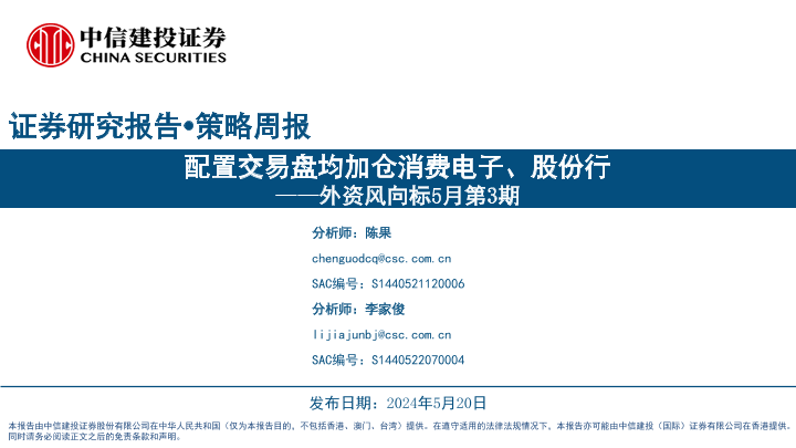 【中信建投证券】【20240520】外资风向标5月第3期:配置交易盘均加仓消费电子、股份行-22页