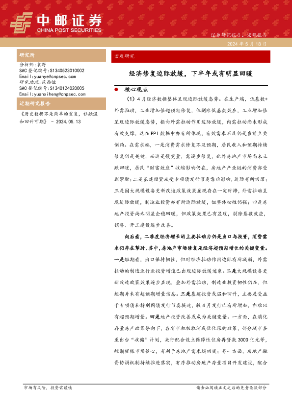 【中邮证券】【20240518】宏观研究:经济修复边际放缓,下半年或有明显回暖-44页