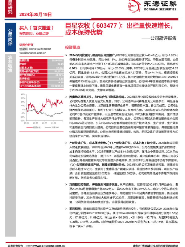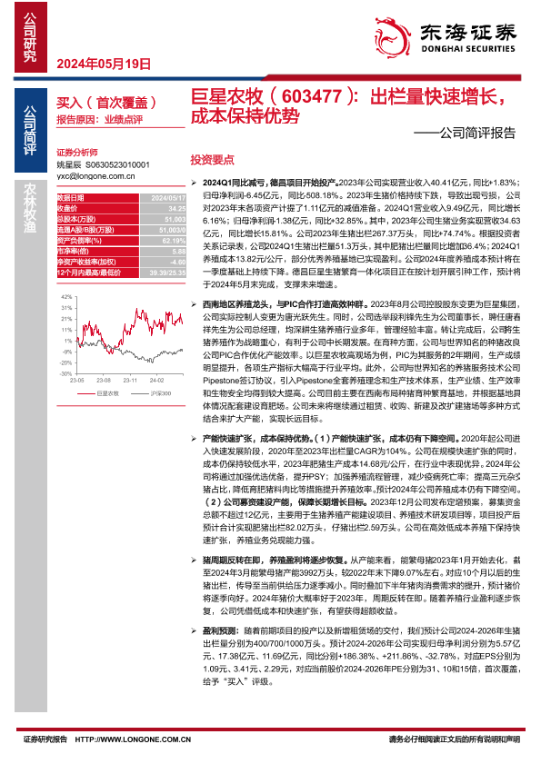 【东海证券】【20240519】巨星农牧-603477.SH-公司简评报告:出栏量快速增长,成本保持优势-16页