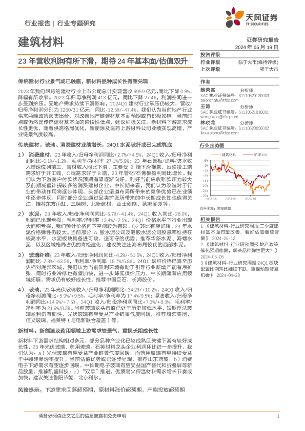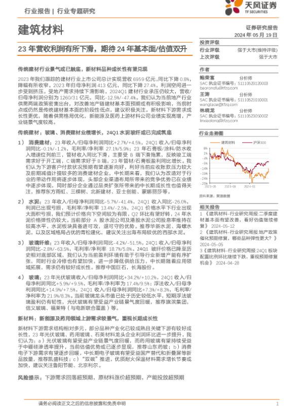 【天风证券】【20240519】建筑材料行业报告:23年营收利润有所下滑,期待24年基本面/估值双升-27页