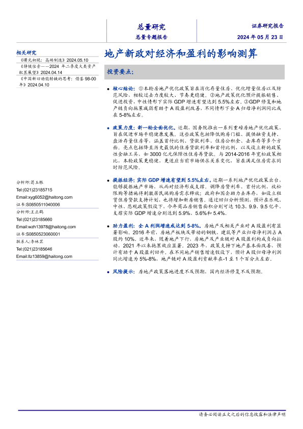 【海通证券】【20240523】总量专题报告:地产新政对经济和盈利的影响测算-13页