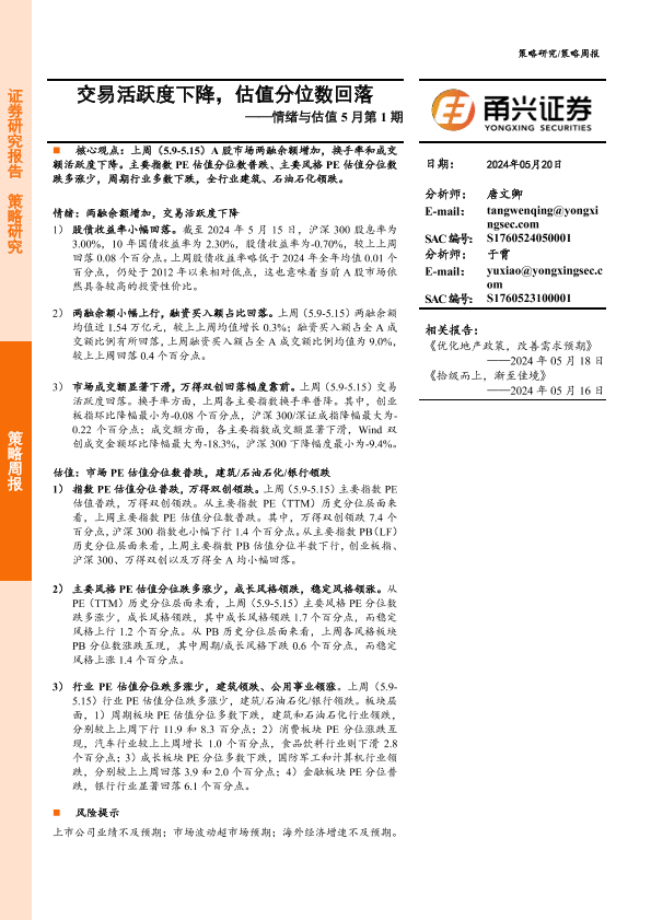 【甬兴证券】【20240520】情绪与估值5月第1期:交易活跃度下降,估值分位数回落-10页