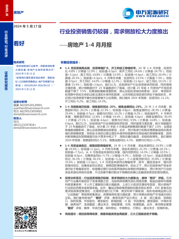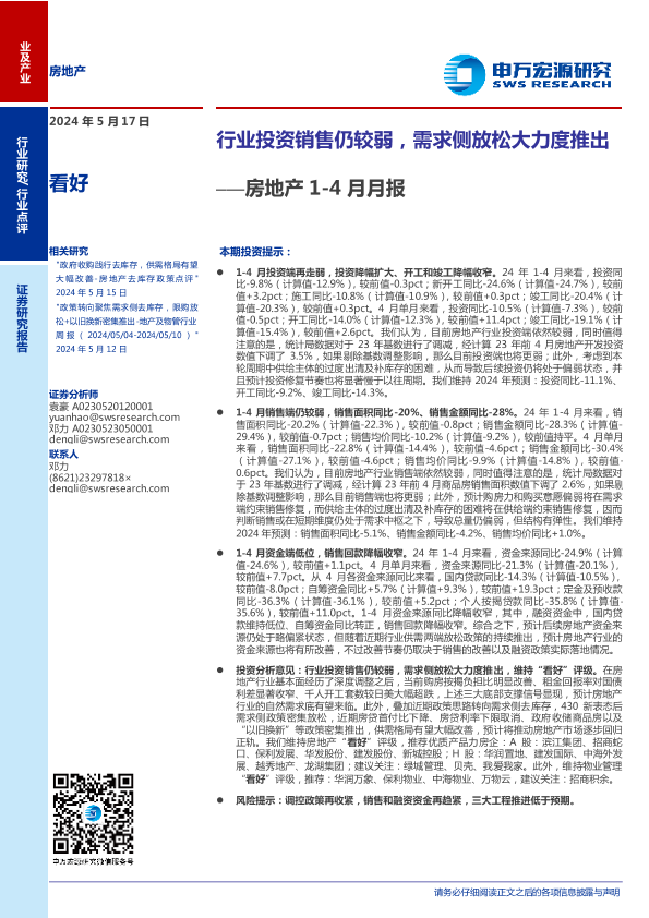 【申万宏源】【20240517】房地产行业1-4月月报:行业投资销售仍较弱,需求侧放松大力度推出-10页