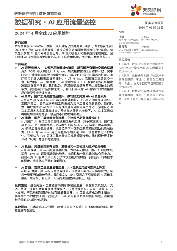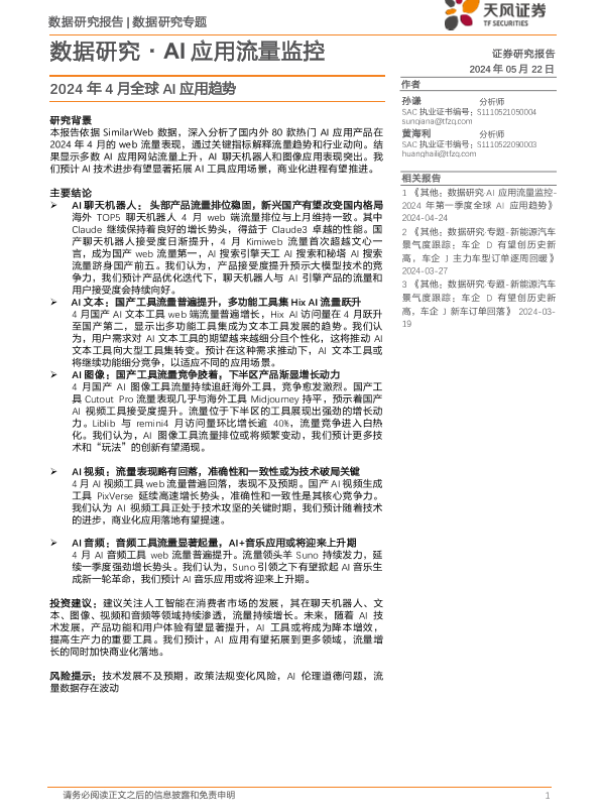 【天风证券】【20240522】数据研究·AI行业应用流量监控:2024年4月全球AI应用趋势-12页