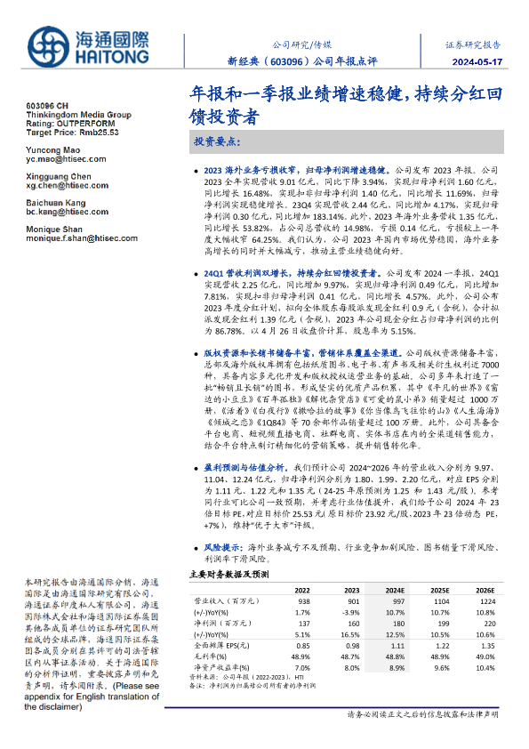 【海通国际】【20240512】新经典-603096.SH-公司年报点评:年报和一季报业绩增速稳健,持续分红回馈投资者-11页