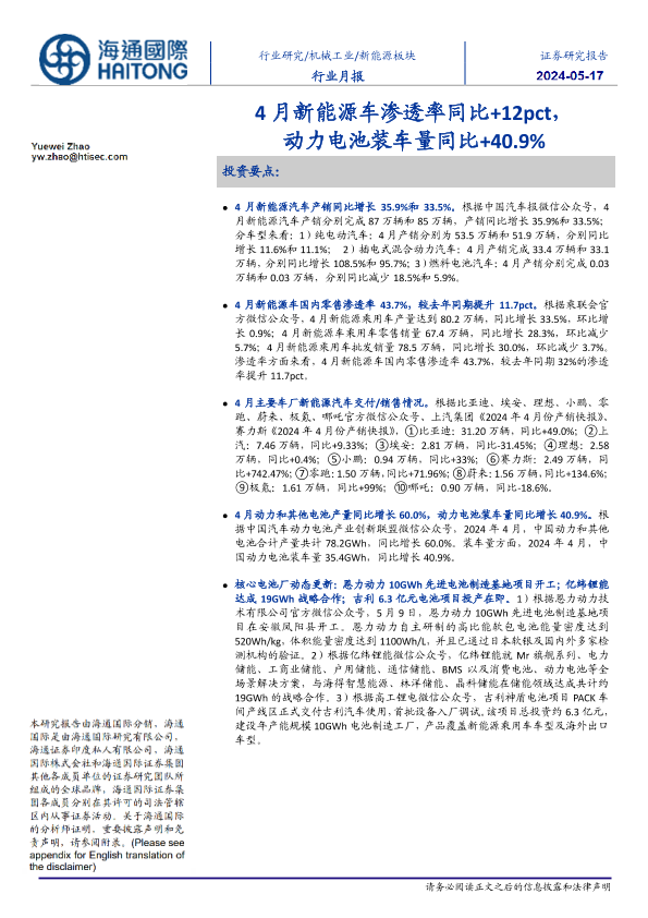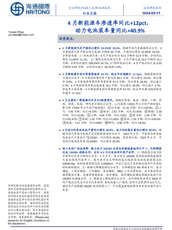 【海通国际】【20241117】新能源板块行业月报:4月新能源车渗透率同比+12pct,动力电池装车量同比+40.9%-240517-海通国际-11月-11页