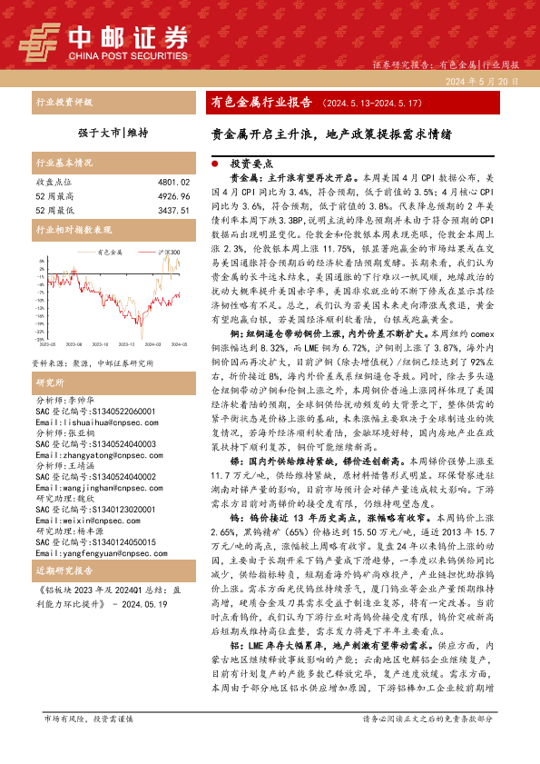 【中邮证券】【20240520】有色金属行业报告:贵金属开启主升浪,地产政策提振需求情绪-13页