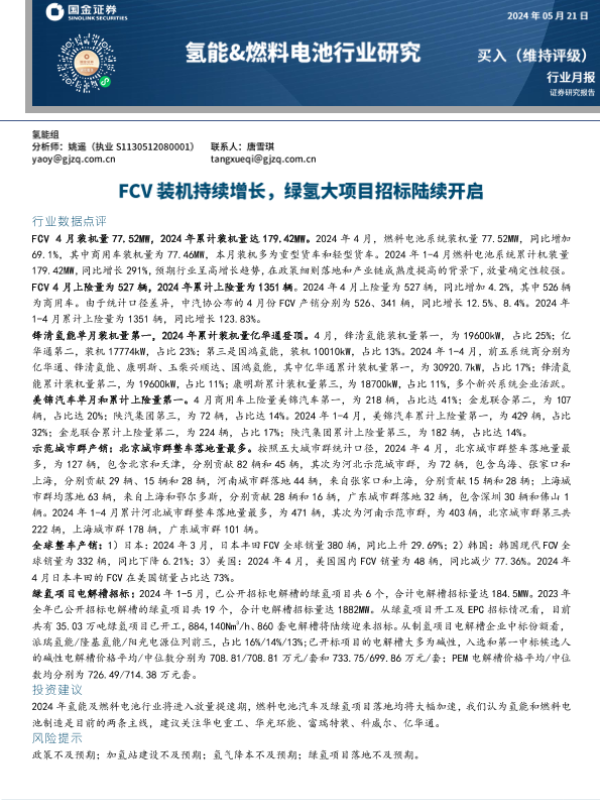 【国金证券】【20240521】氢能&燃料电池行业月报:FCV装机持续增长,绿氢大项目招标陆续开启-14页