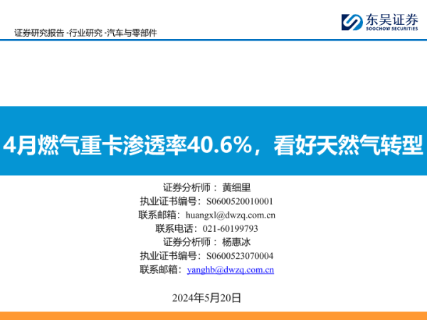 【东吴证券】【20240520】汽车与零部件行业:4月燃气重卡渗透率40.6%,看好天然气转型-23页