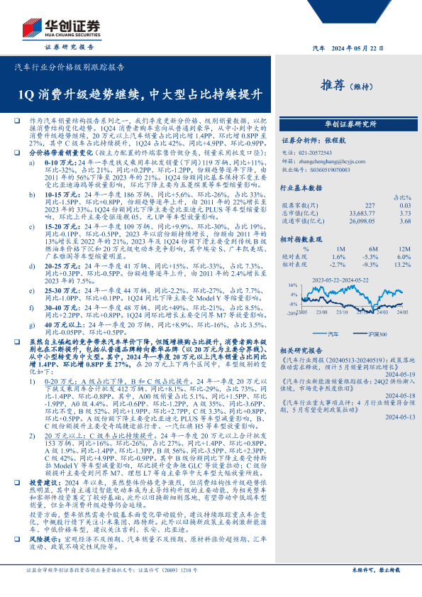 【华创证券】【20240522】汽车行业分价格级别跟踪报告:1Q消费升级趋势继续,中大型占比持续提升-11页