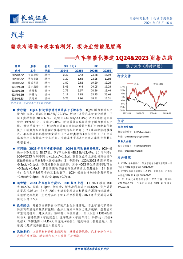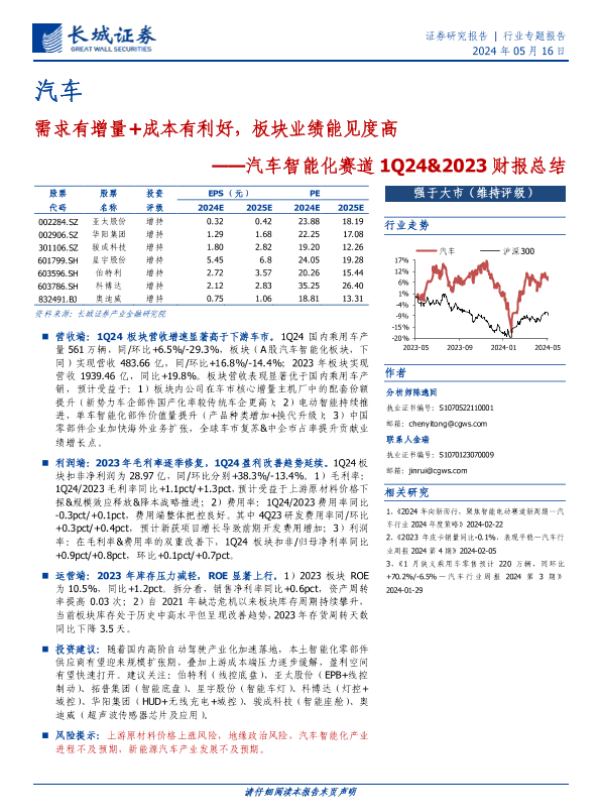 【长城证券】【20240516】汽车行业智能化赛道1Q24&2023财报总结:需求有增量+成本有利好,板块业绩能见度高-20页