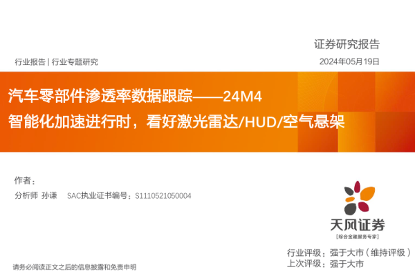 【天风证券】【20240519】汽车零部件行业渗透率数据跟踪24M4:智能化加速进行时,看好激光雷达/HUD/空气悬架-43页