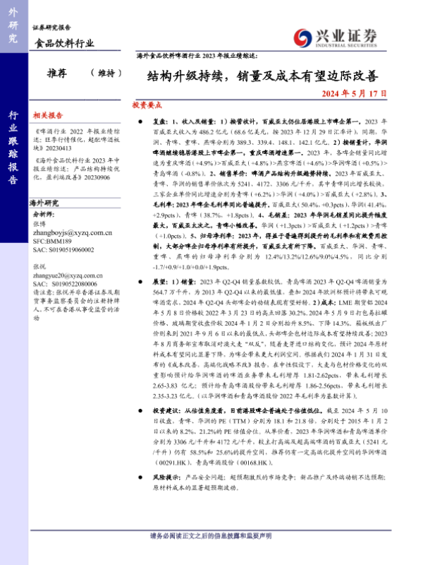 【兴业证券】【20240517】海外食品饮料啤酒行业2023年报业绩综述:结构升级持续,销量及成本有望边际改善-11页