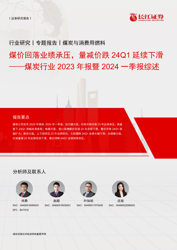 【长江证券】【20240520】煤炭行业2023年报暨2024一季报综述:煤价回落业绩承压,量减价跌24Q1延续下滑-46页