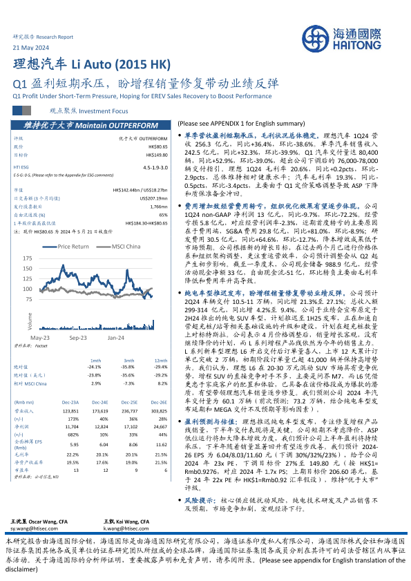 【海通国际】【20240521】理想汽车Q1盈利短期承压,盼增程销量修复带动业绩反弹-14页
