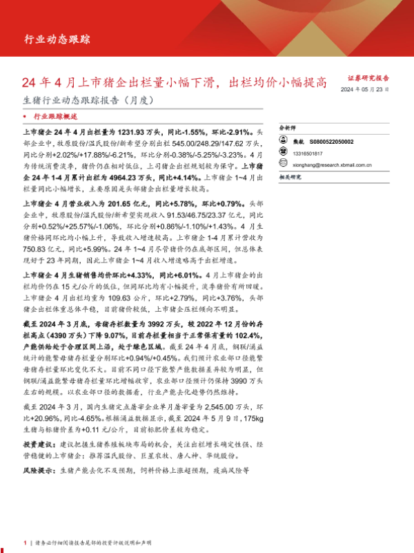 【西部证券】【20240523】生猪行业动态跟踪报告(月度):24年4月上市猪企出栏量小幅下滑,出栏均价小幅提高-15页