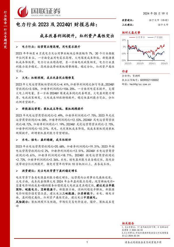 【国联证券】【20240519】电力行业2023及2024Q1财报总结:成本改善利润提升,红利资产属性突出-32页