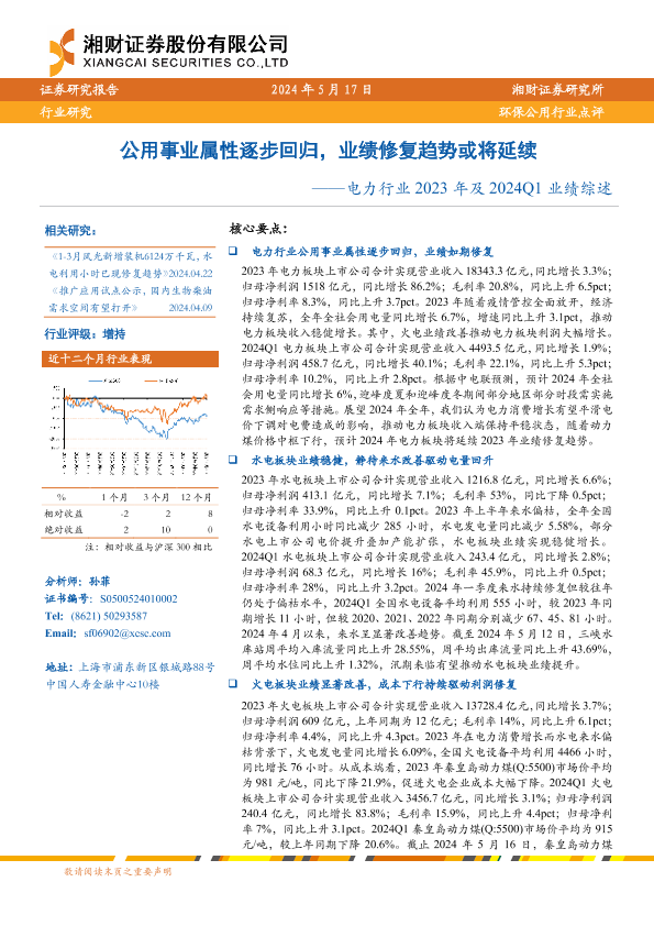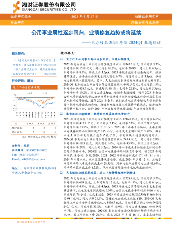 【湘财证券】【20240517】电力行业2023年及2024Q1业绩综述:公用事业属性逐步回归,业绩修复趋势或将延续-10页