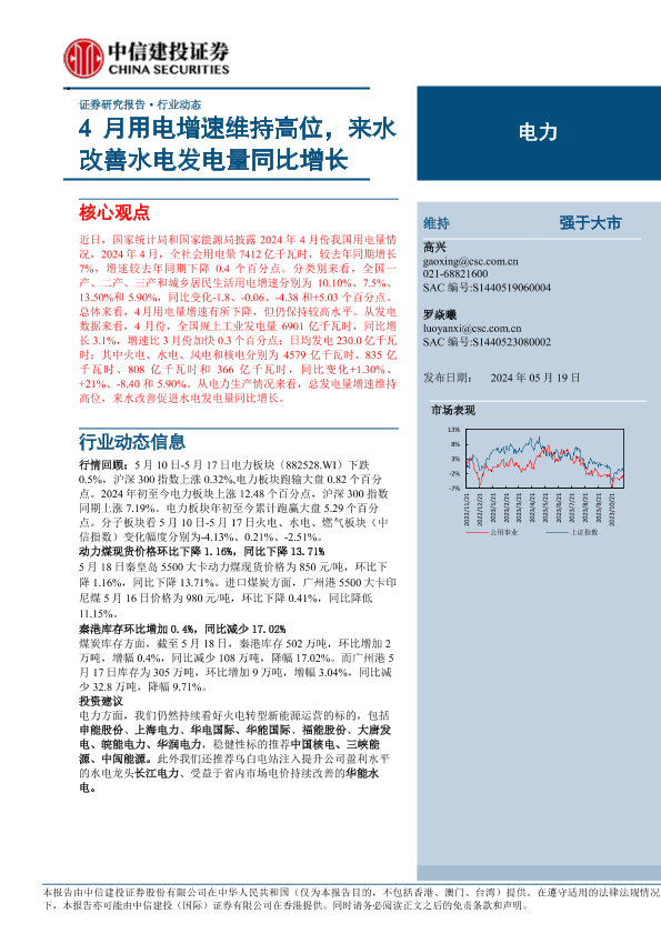【中信建投证券】【20240519】电力行业:4月用电增速维持高位,来水改善水电发电量同比增长-21页