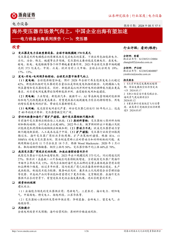 【浙商证券】【20240517】电力设备行业出海系列报告(一):变压器,海外变压器市场景气向上,中国企业出海有望加速-26页