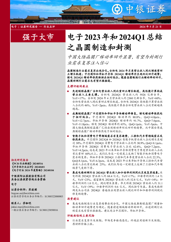 【中银证券】【20240521】电子行业2023年和2024Q1总结之晶圆制造和封测:中国大陆晶圆厂稼动率回升显著,有望为封测行业需求复苏注入信心-22页