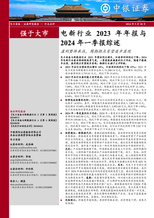 【中银证券】【20240520】电新行业2023年年报与2024年一季报综述:盈利整体承压,周期拐点有望逐步显现-10页