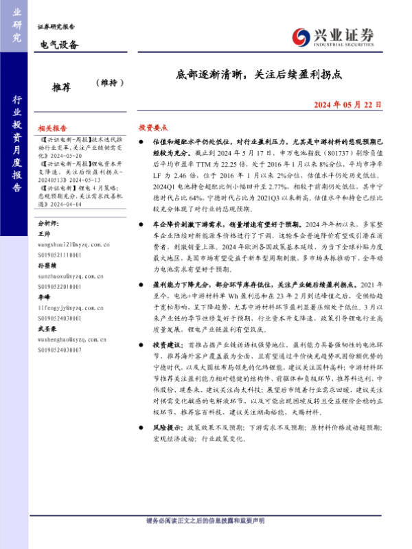 【兴业证券】【20240522】电气设备行业投资月度报告:底部逐渐清晰,关注后续盈利拐点-17页