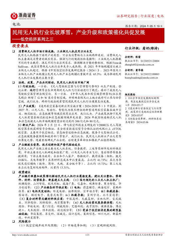 【浙商证券】【20240519】电池行业低空经济系列之三:民用无人机行业长坡厚雪,产业升级和政策催化共促发展-21页