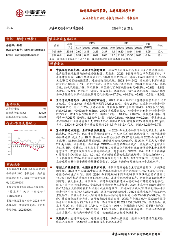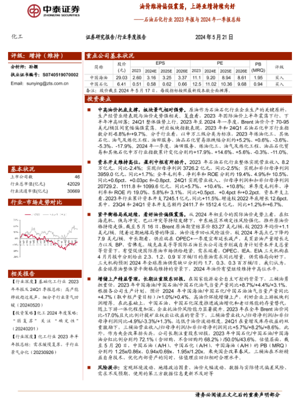 【中泰证券】【20240521】石油石化行业2023年报与2024年一季报总结:油价维持偏强震荡,上游业绩持续向好-15页