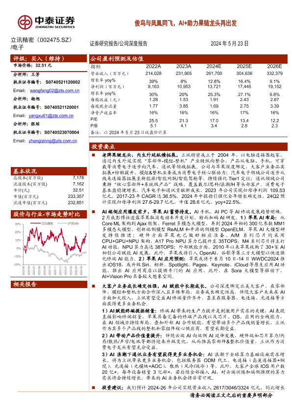 【中泰证券】【20240523】立讯精密(002475)俊鸟与凤凰同飞,AI+助力果链龙头再出发-33页