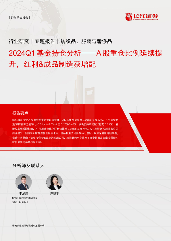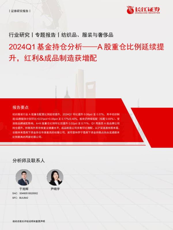 【长江证券】【20240519】纺织品、服装与奢侈品行业2024Q1基金持仓分析:A股重仓比例延续提升,红利&成品制造获增配-12页