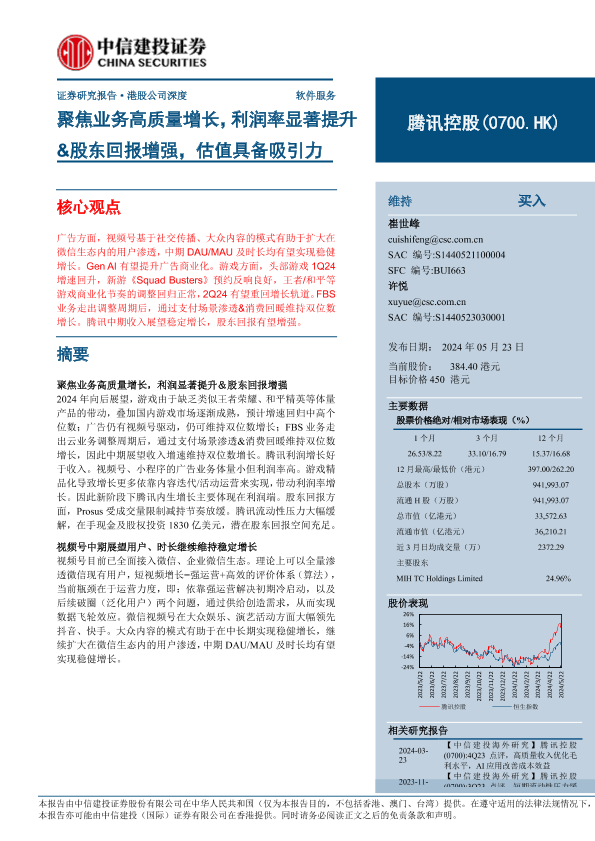 【中信建投证券】【20240523】腾讯控股(0700.HK)聚焦业务高质量增长,利润率显著提升&股东回报增强,估值具备吸引力-27页