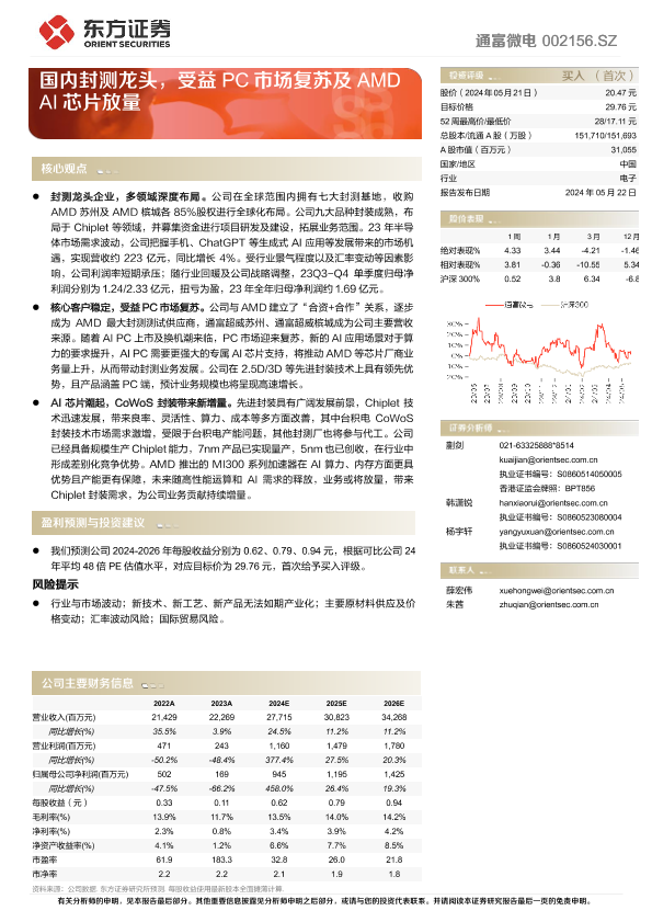 【东方证券】【20240522】通富微电(002156)国内封测龙头,受益PC市场复苏及AMD+AI芯片放量-25页