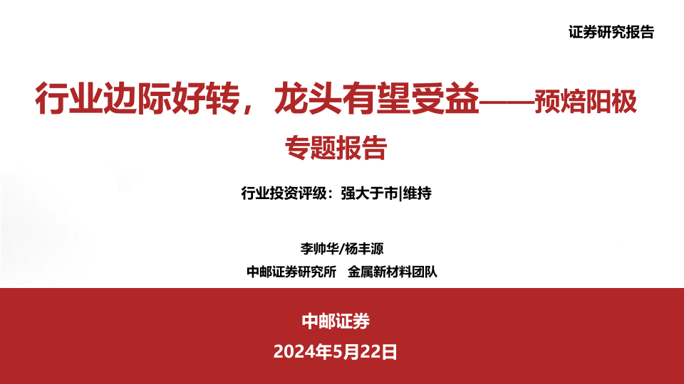 【中邮证券】【20240522】金属新材料行业预焙阳极专题报告:行业边际好转,龙头有望受益-30页