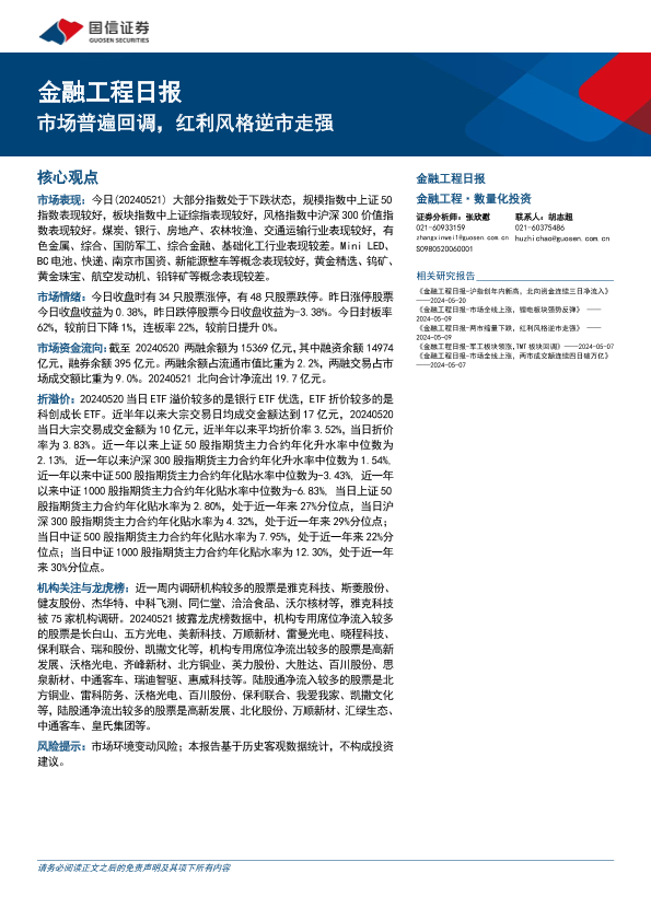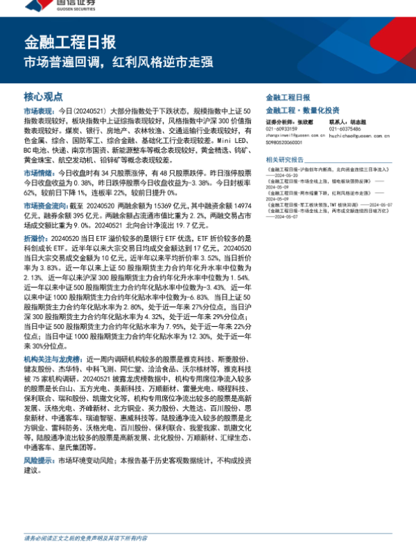 【国信证券】【20240521】金融工程:市场普遍回调,红利风格逆市走强-15页