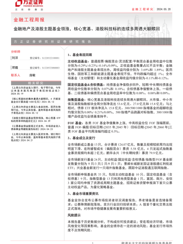 【方正证券】【20240520】金融工程:金融地产及港股主题基金领涨,核心宽基、港股科技标的连续多周遇大额赎回-17页